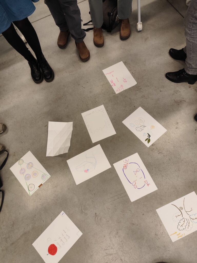 I partecipanti – 9 di cui 2 insegnanti in servizio, una della scuola dell’infanzia e una della scuola primaria, e 7 studentesse di Scienze della Formazione Primaria, alcune già con incarichi nella scuola – hanno prodotto le loro creazioni utilizzando, per nostra scelta, solo fogli bianchi formato A4 e matite o pennarelli.