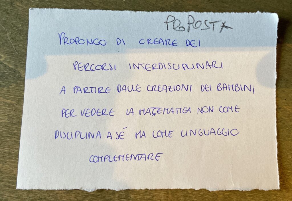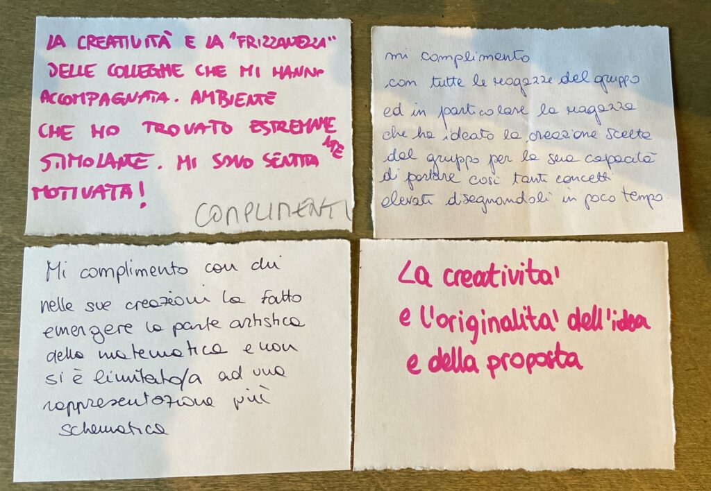 I feedback dei partecipanti al termine dell’attività sono stati interessanti: dimostrano come, allo spiazzamento iniziale, sia seguito un grande coinvolgimento nella ricerca comune dei significati matematici, e, forse, un desiderio di applicare quanto sperimentato nelle loro classi presenti e future.