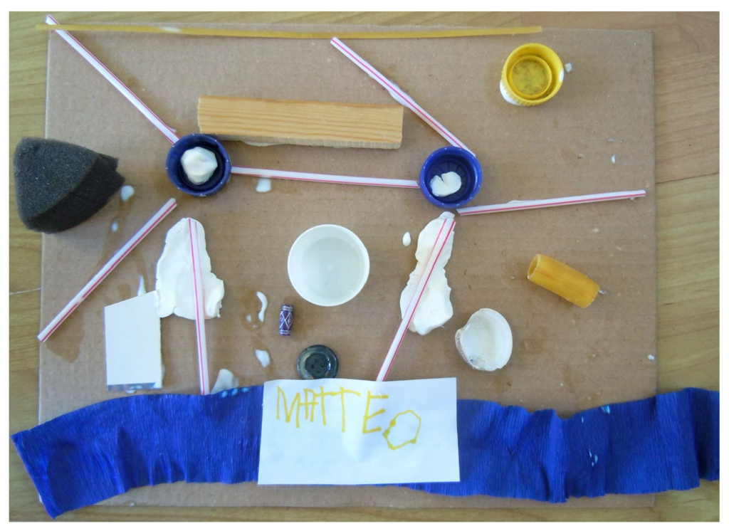 Ad esempio per l’esperienza riferita alla scuola dell’infanzia e intitolata Giochiamo con i pattern il percorso che si è sviluppato a partire da questa creazione realizzata con materiali poveri: