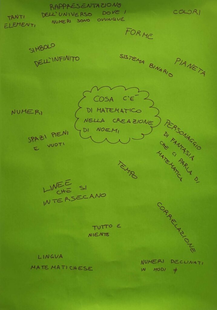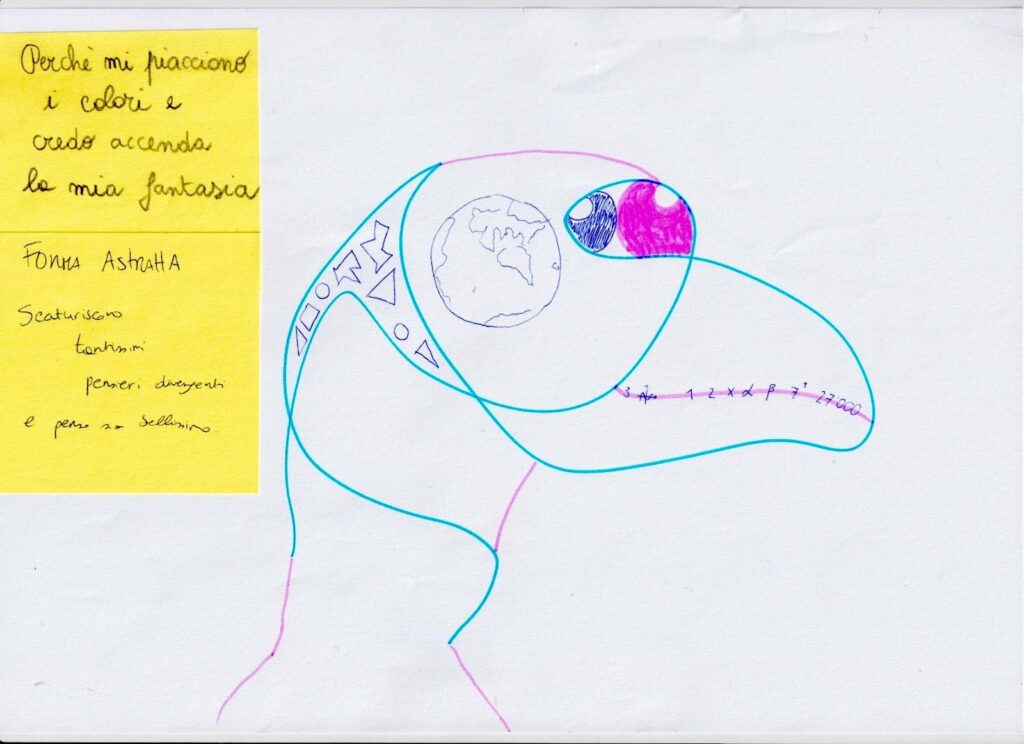 La forma suggeriva per alcuni un uccello, altri invece si sono soffermati sull’intreccio delle linee, interessanti da analizzare dal punto di vista topologico per la continuità e le connessioni. Gli elementi più “matematici” erano le forme e i simboli matematici presenti nel “becco”, ma, in contrasto con le nostre aspettative, la discussione non si è sviluppata a partire da questi elementi; hanno attirato maggiormente l’attenzione il mondo e l’“occhio” con le due “pupille” colorate. Come è scritto su un post-it, dall’osservazione “scaturiscono tantissimi pensieri divergenti”, è una figura che “accende la fantasia”.