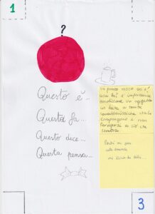 Dopo il momento della creazione abbiamo esposto tutti i lavori e chiesto di scegliere una sola creazione scrivendo su un post-it perché l’avevano scelta. Non tutte sono state scelte: Doc. 1, 5 e 6 sono state scelte da due persone, dovendo poi sceglierne una tutti hanno optato per il Doc. 6.