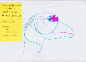 La forma suggeriva per alcuni un uccello, altri invece si sono soffermati sull’intreccio delle linee, interessanti da analizzare dal punto di vista topologico per la continuità e le connessioni. Gli elementi più “matematici” erano le forme e i simboli matematici presenti nel “becco”, ma, in contrasto con le nostre aspettative, la discussione non si è sviluppata a partire da questi elementi; hanno attirato maggiormente l’attenzione il mondo e l’“occhio” con le due “pupille” colorate. Come è scritto su un post-it, dall’osservazione “scaturiscono tantissimi pensieri divergenti”, è una figura che “accende la fantasia”.