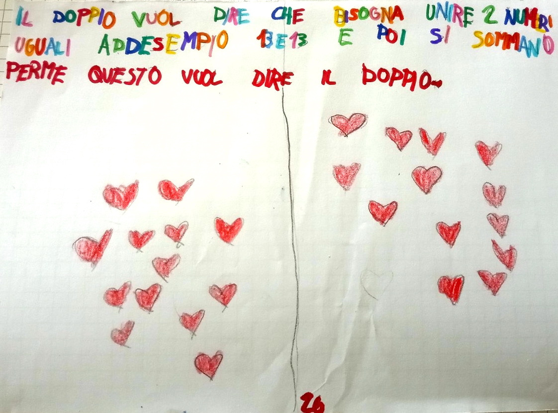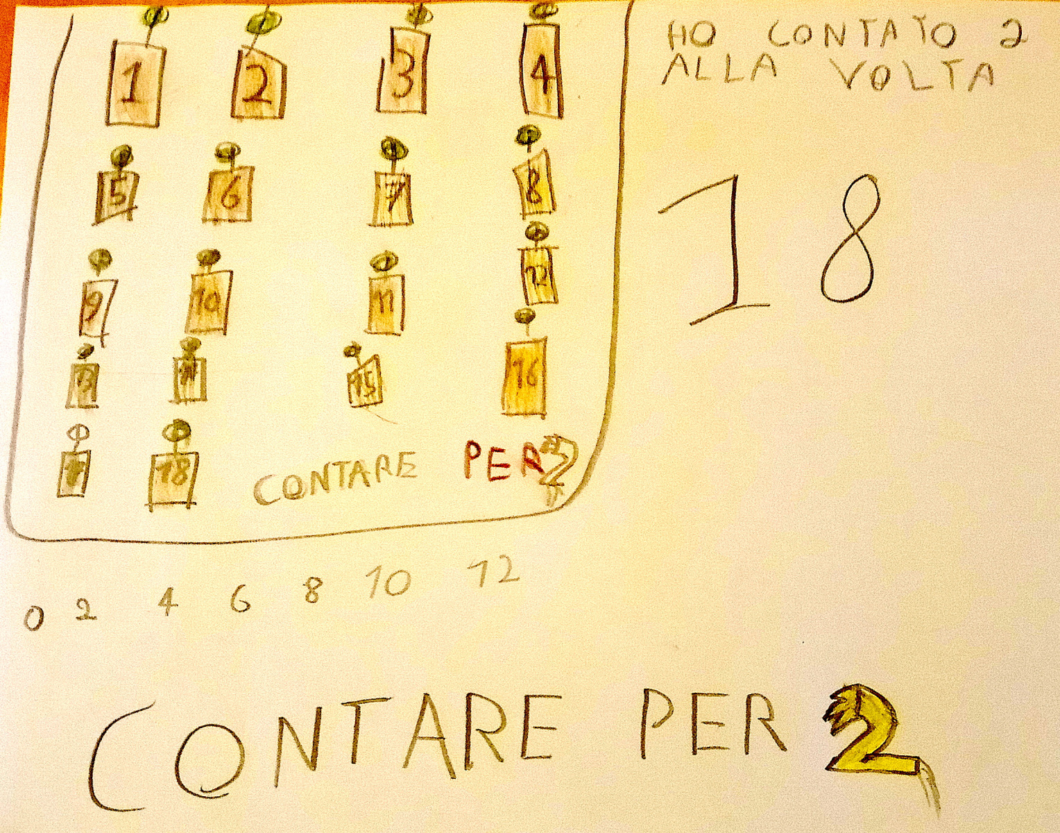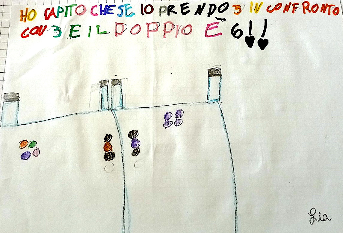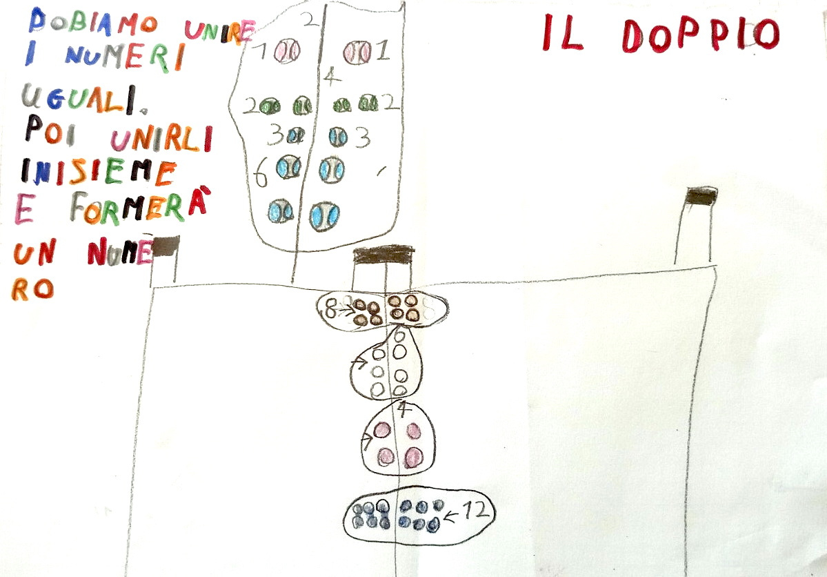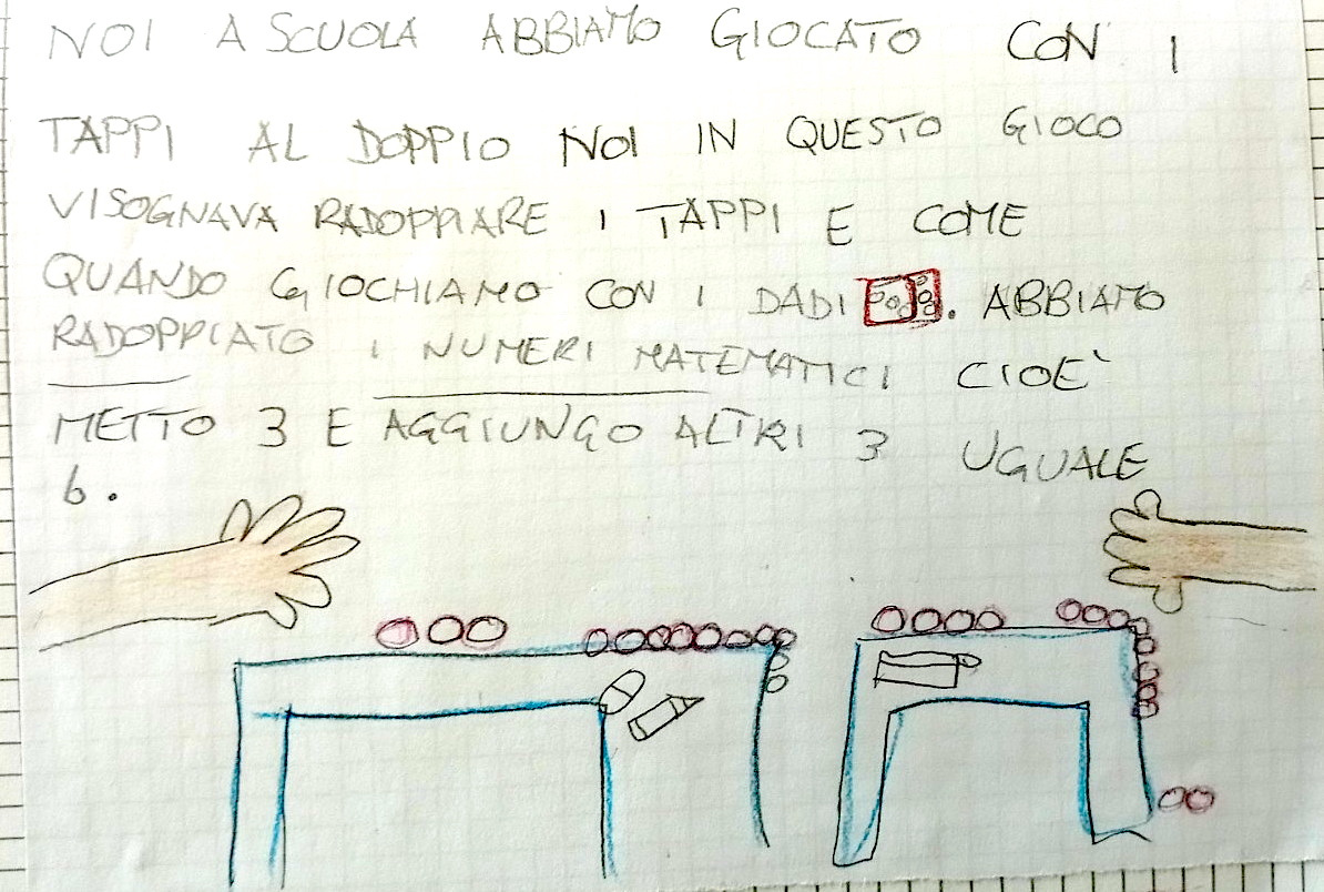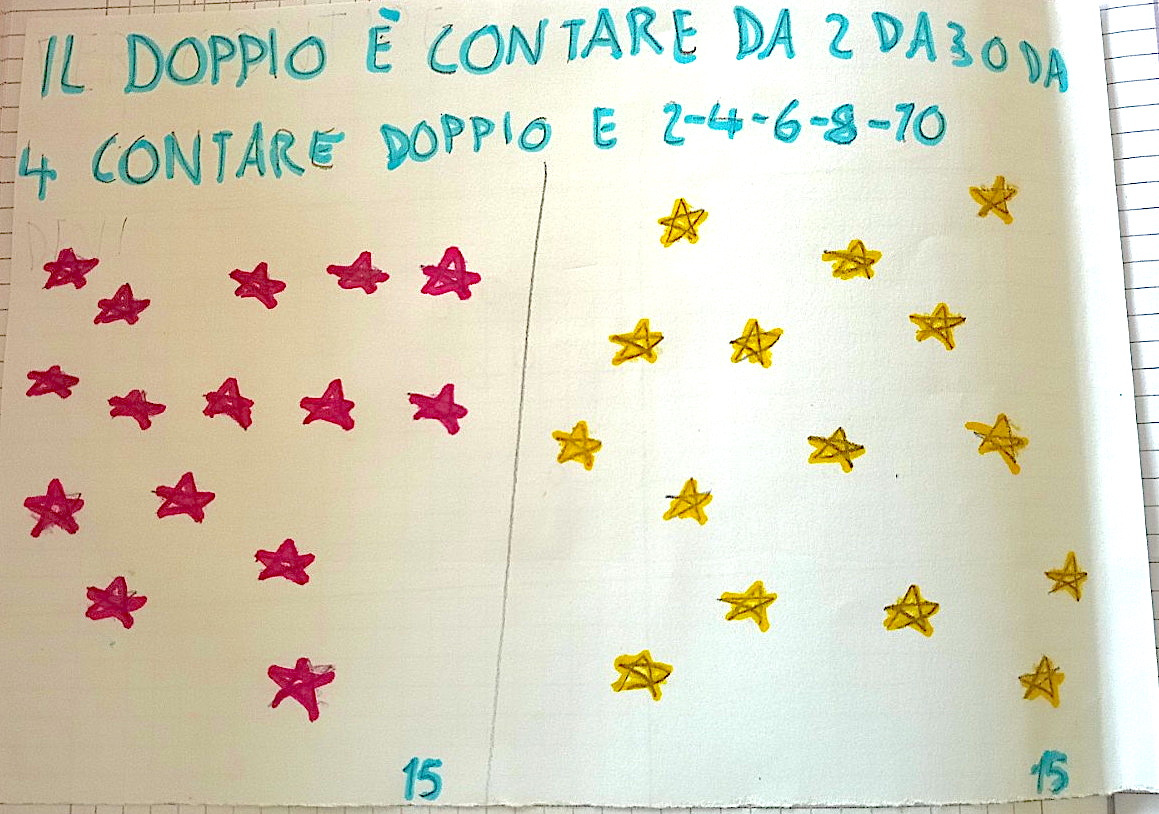 Il percorso sulle strutture moltiplicative inizia dall’idea di DOPPIO di un numero. Ho proposto dapprima un’attività ludica, usando i tappi e i portauova, per verificare quanti dei bambini sapessero contare per 2. Qualche giorno dopo ho chiesto di raccontarmi la loro idea del doppio di un numero con un disegno. Sono emersi vari elementi da riprendere: l’idea di numero che si ripete, l’uso dell’addizione per unire i numeri, l’uso del segno matematico X per abbreviare l’operazione.