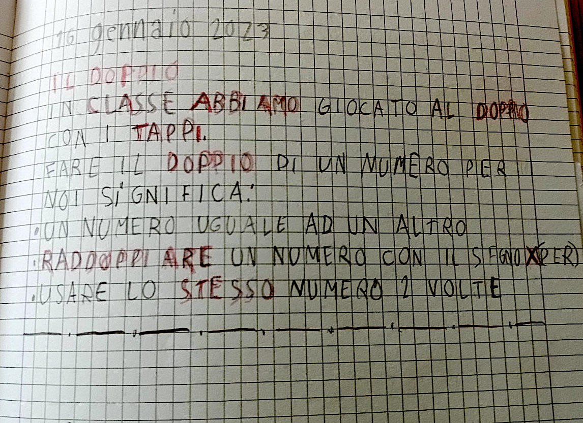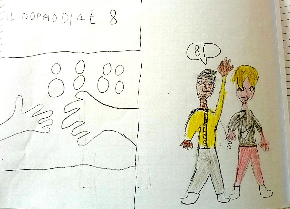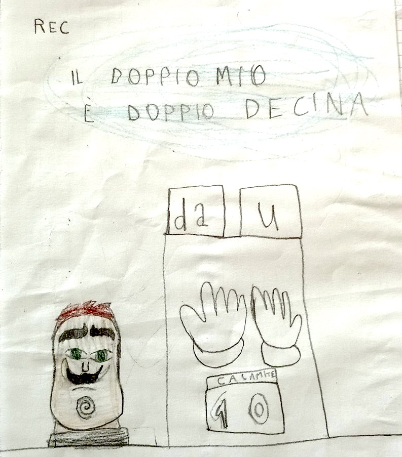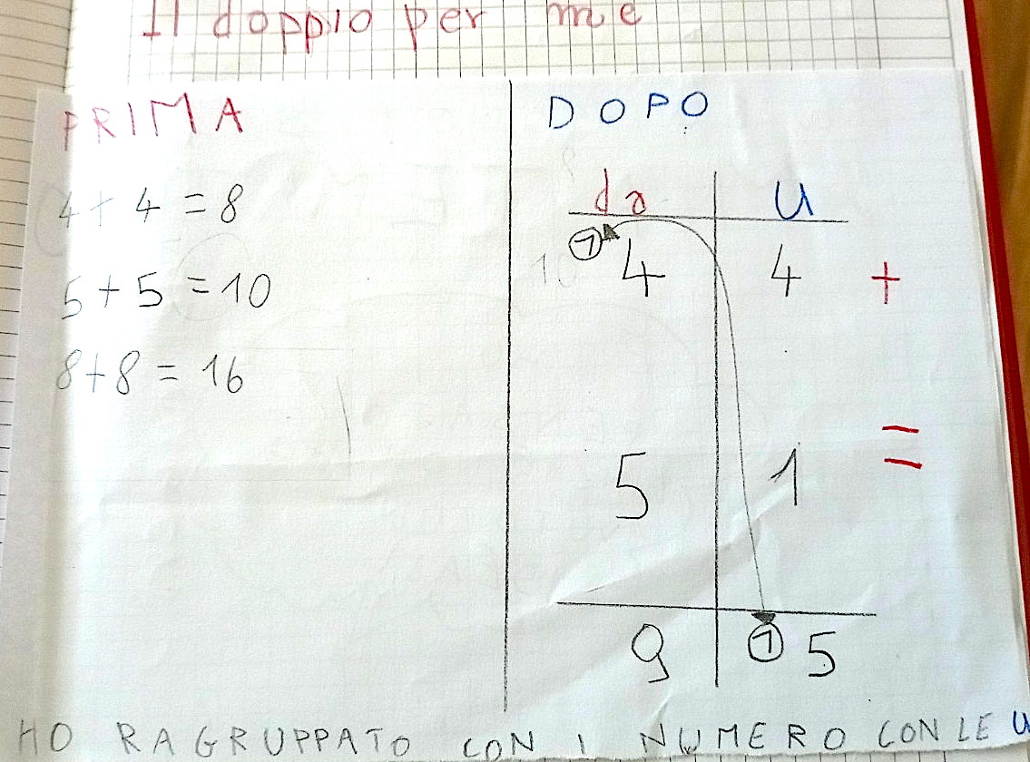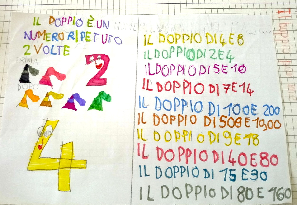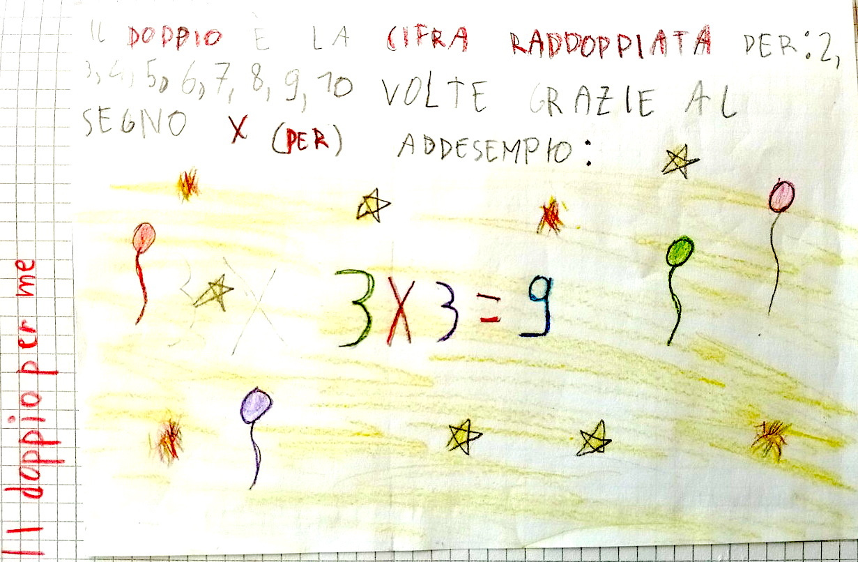 Il percorso sulle strutture moltiplicative inizia dall’idea di DOPPIO di un numero. Ho proposto dapprima un’attività ludica, usando i tappi e i portauova, per verificare quanti dei bambini sapessero contare per 2. Qualche giorno dopo ho chiesto di raccontarmi la loro idea del doppio di un numero con un disegno. Sono emersi vari elementi da riprendere: l’idea di numero che si ripete, l’uso dell’addizione per unire i numeri, l’uso del segno matematico X per abbreviare l’operazione.
