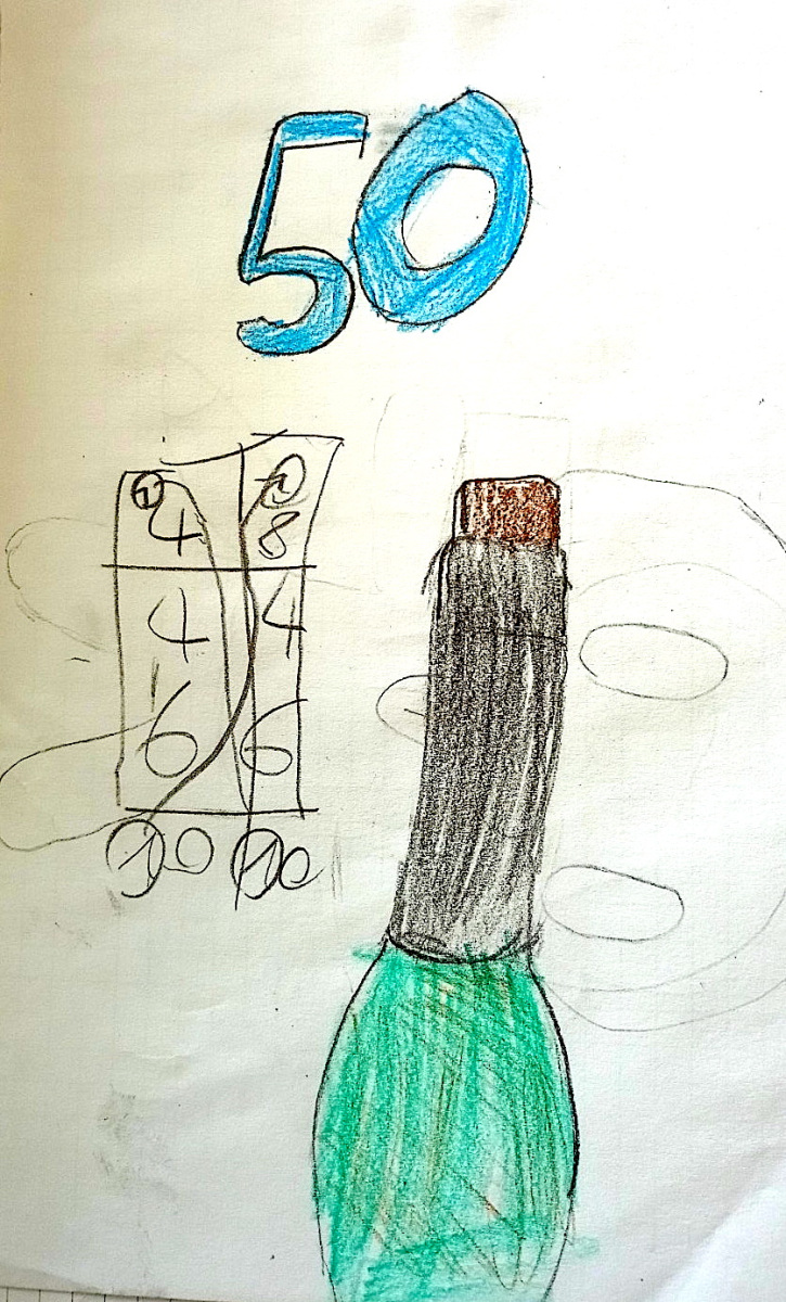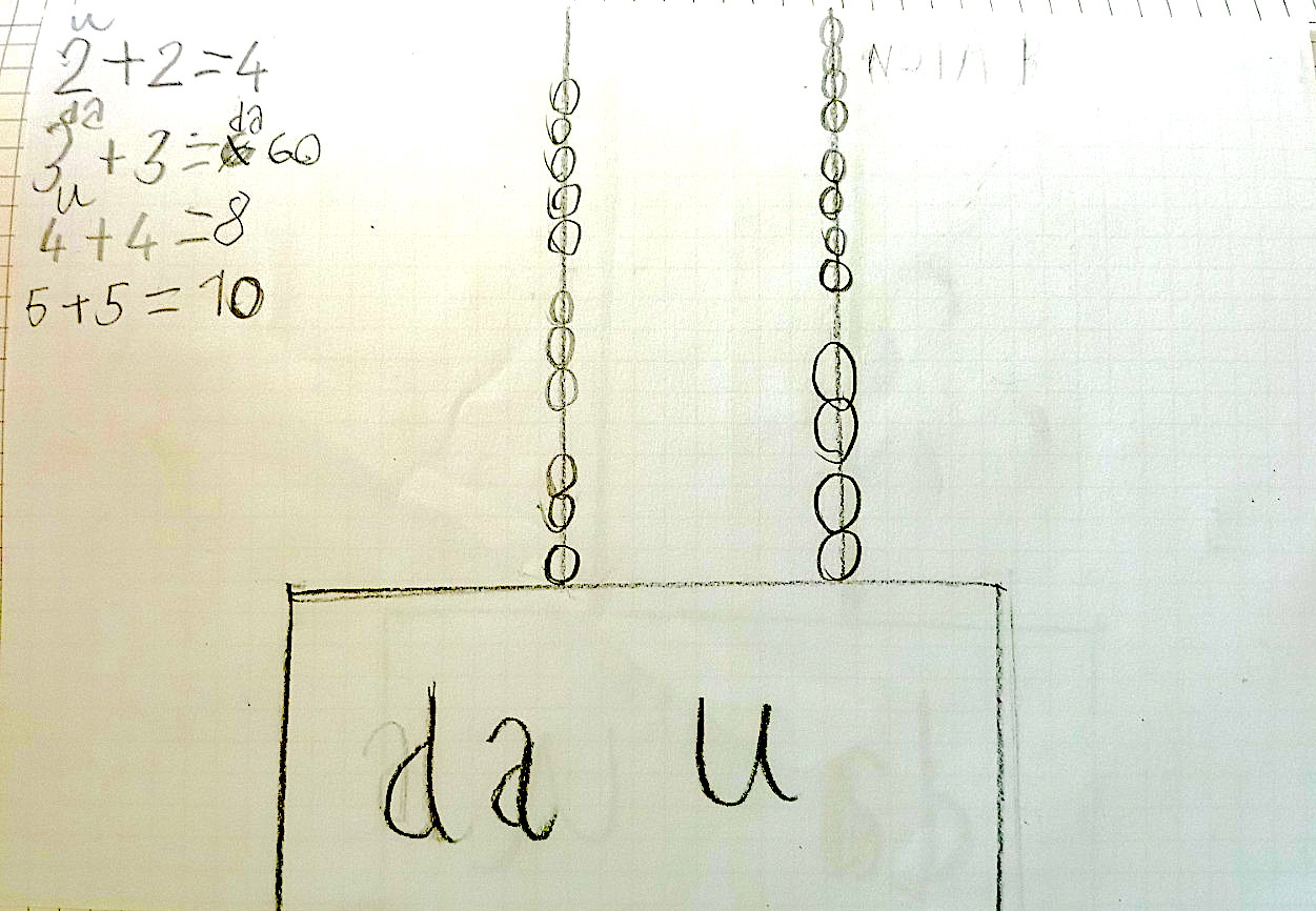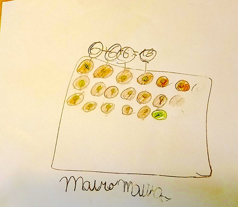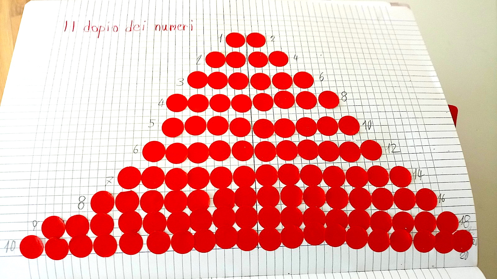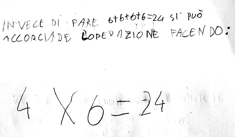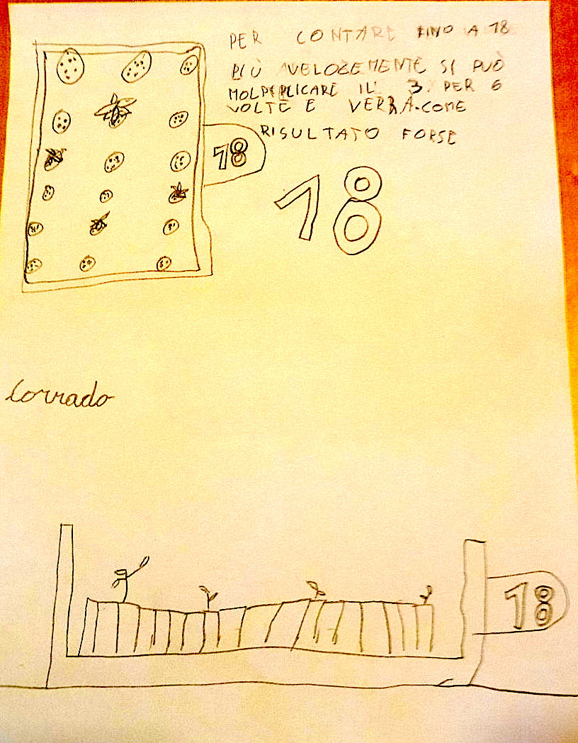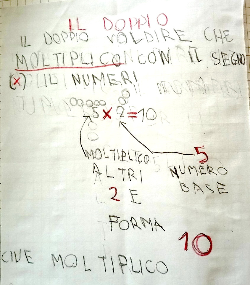 Il percorso sulle strutture moltiplicative inizia dall’idea di DOPPIO di un numero. Ho proposto dapprima un’attività ludica, usando i tappi e i portauova, per verificare quanti dei bambini sapessero contare per 2. Qualche giorno dopo ho chiesto di raccontarmi la loro idea del doppio di un numero con un disegno. Sono emersi vari elementi da riprendere: l’idea di numero che si ripete, l’uso dell’addizione per unire i numeri, l’uso del segno matematico X per abbreviare l’operazione.