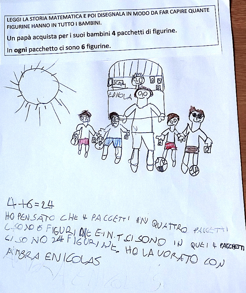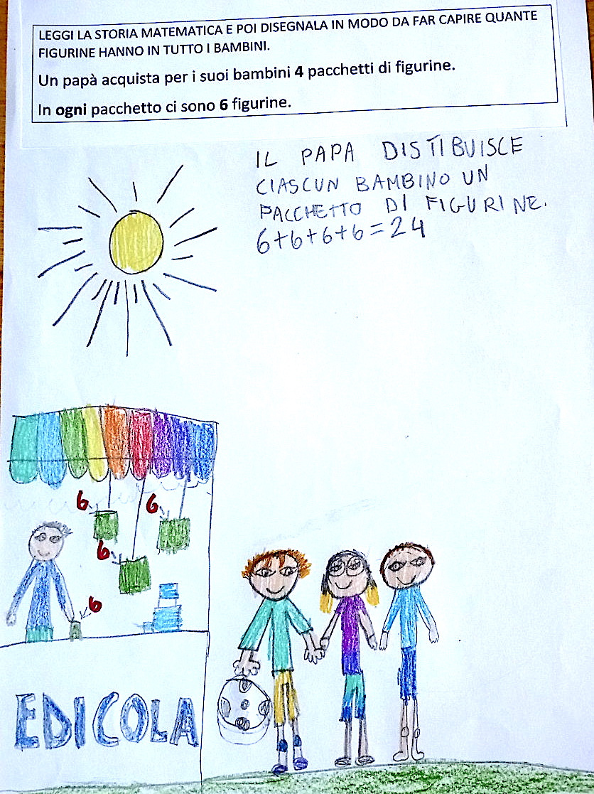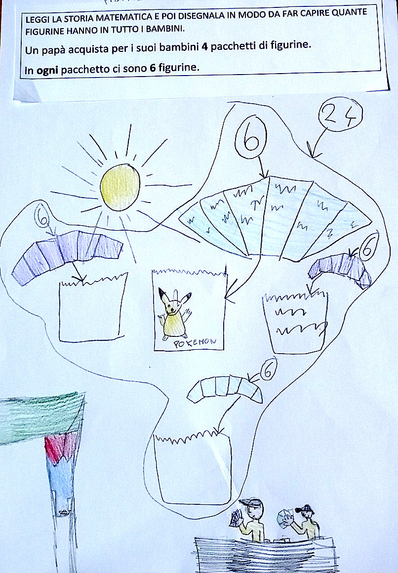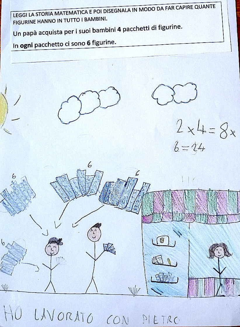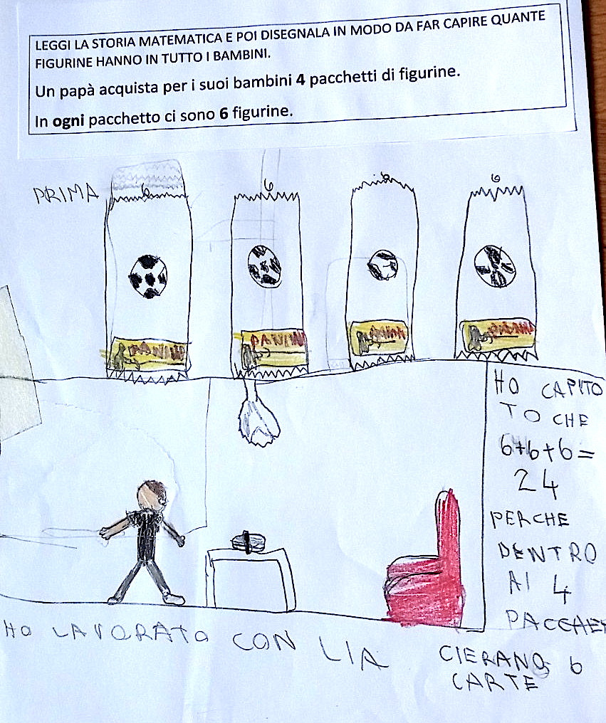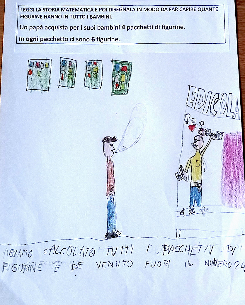 La scorsa settimana ho colto l’occasione della giornata dello scambio delle figurine per proporre un problema da rappresentare sullo stesso tema. I bambini hanno lavorato a coppie, aiutandosi. Alcuni si sono espressi più “artisticamente”, altri hanno colto la struttura matematica del testo.