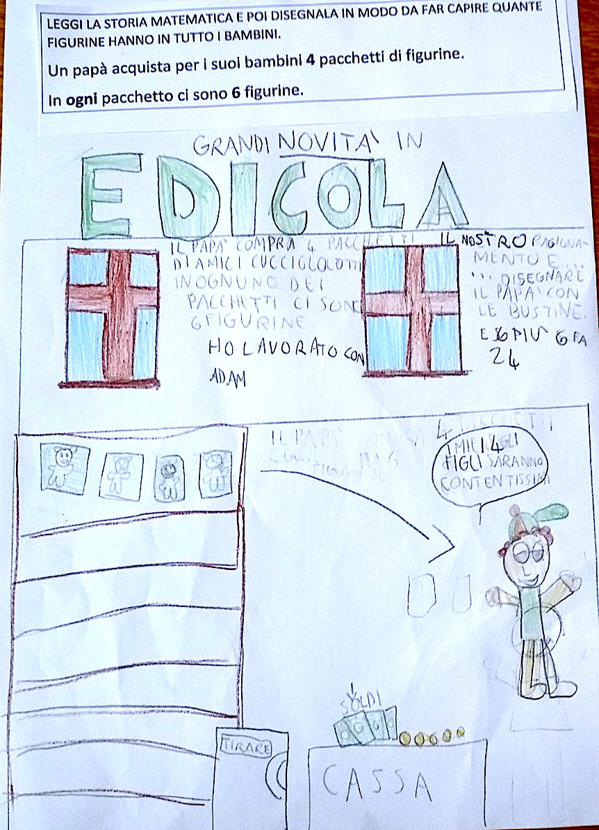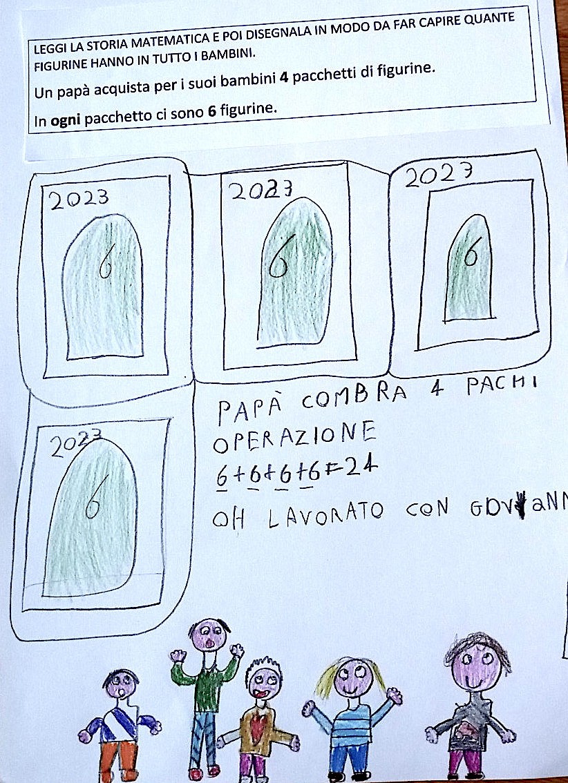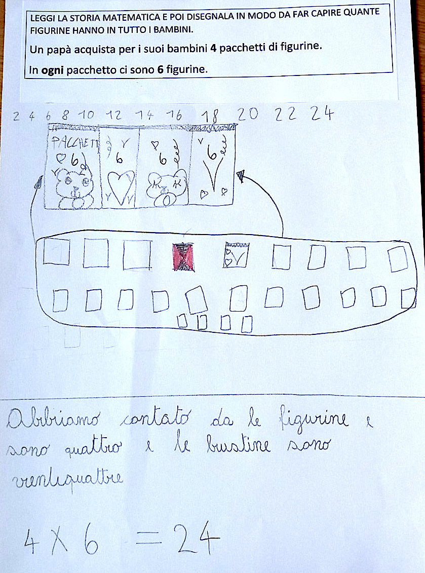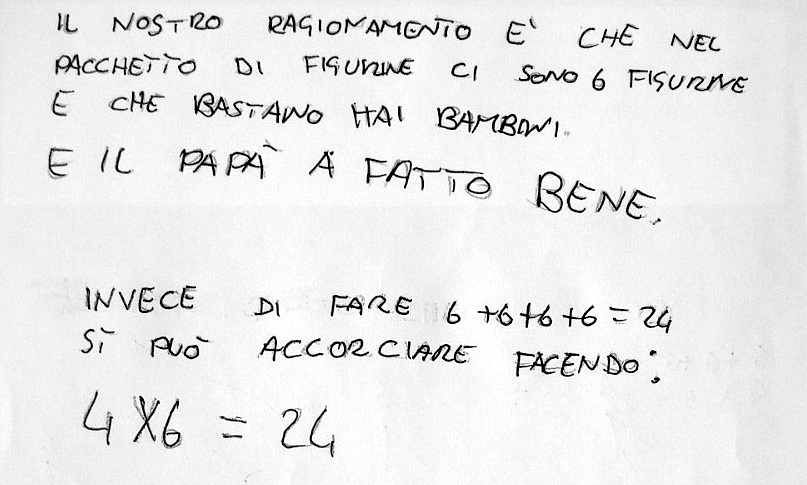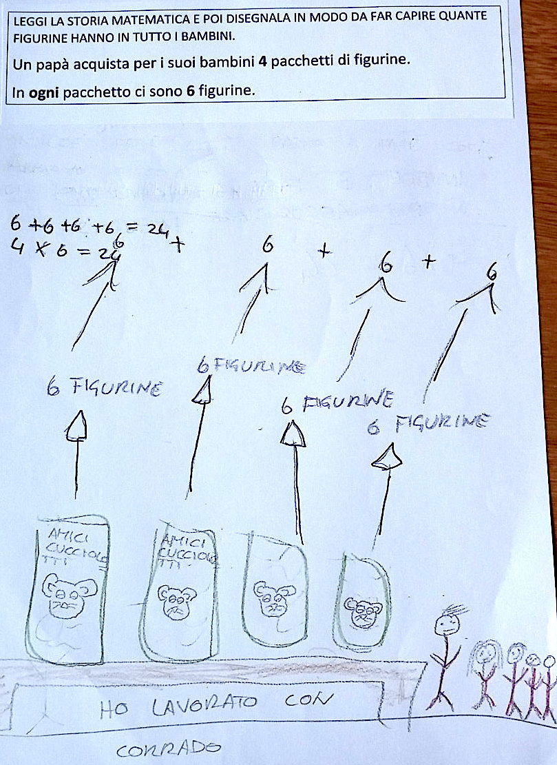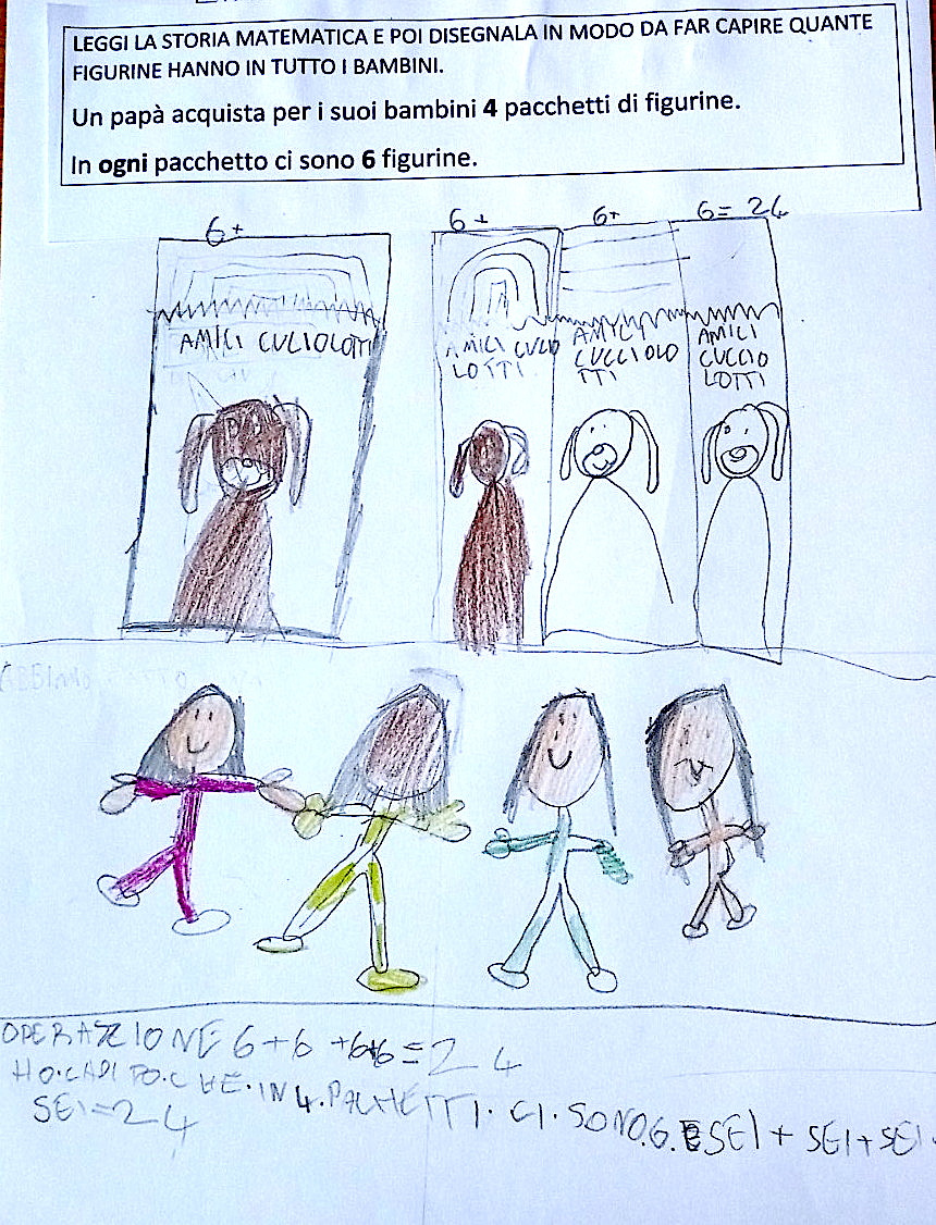 La scorsa settimana ho colto l’occasione della giornata dello scambio delle figurine per proporre un problema da rappresentare sullo stesso tema. I bambini hanno lavorato a coppie, aiutandosi. Alcuni si sono espressi più “artisticamente”, altri hanno colto la struttura matematica del testo.