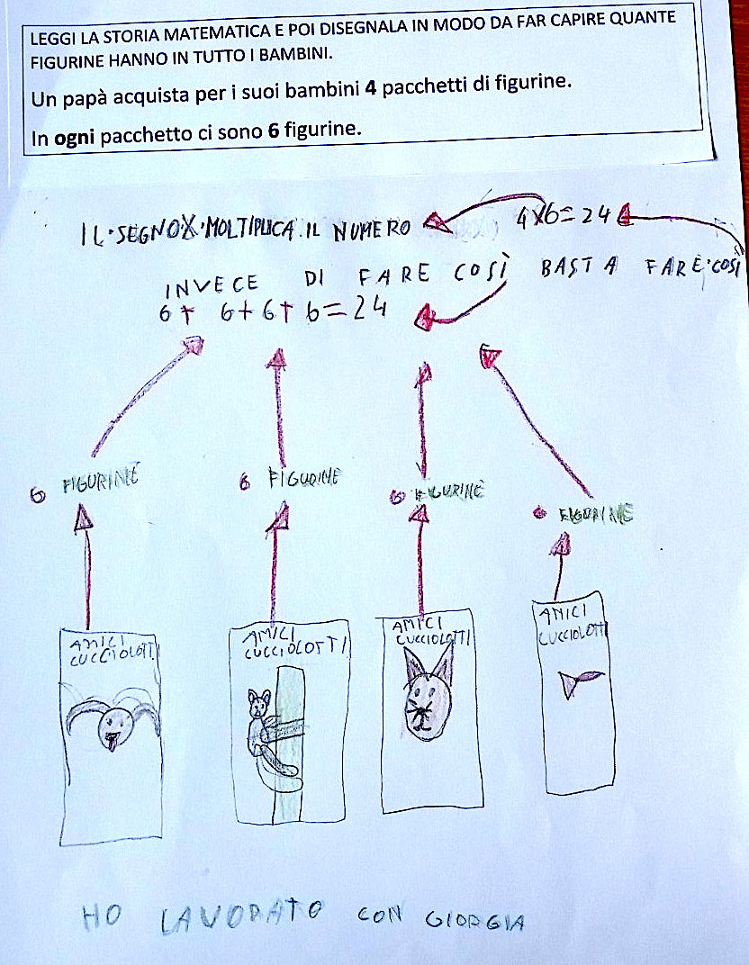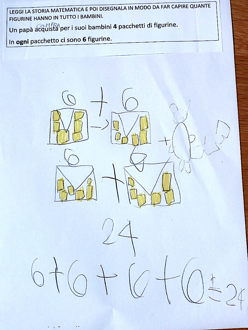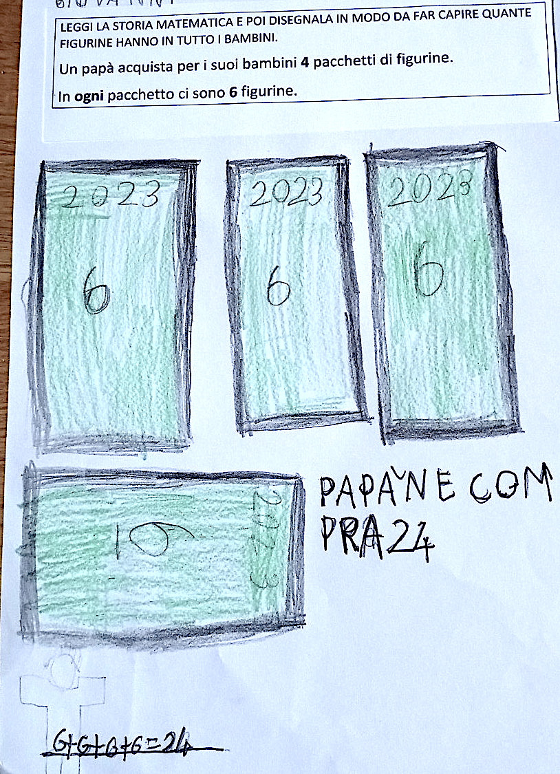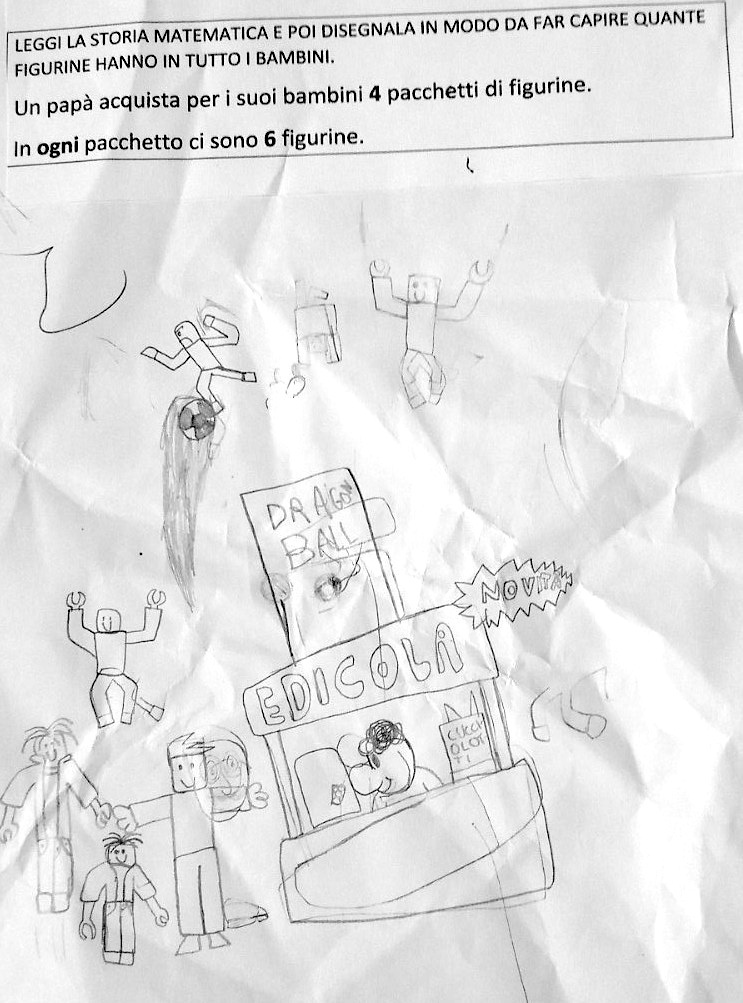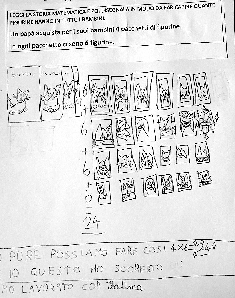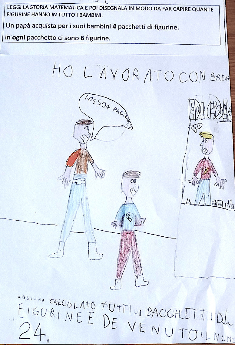 La scorsa settimana ho colto l’occasione della giornata dello scambio delle figurine per proporre un problema da rappresentare sullo stesso tema. I bambini hanno lavorato a coppie, aiutandosi. Alcuni si sono espressi più “artisticamente”, altri hanno colto la struttura matematica del testo.