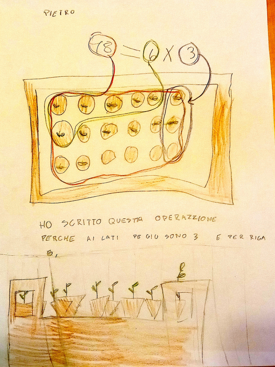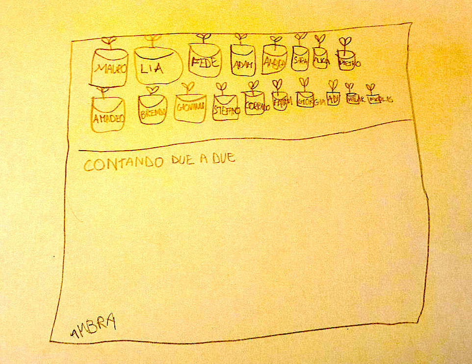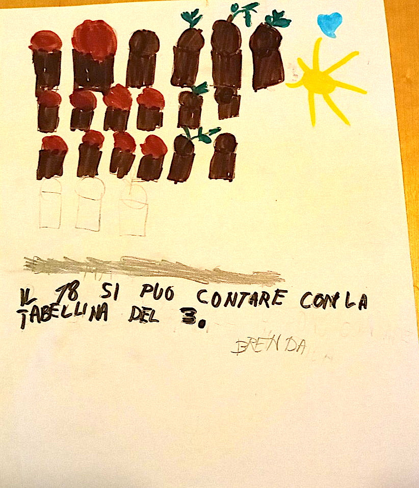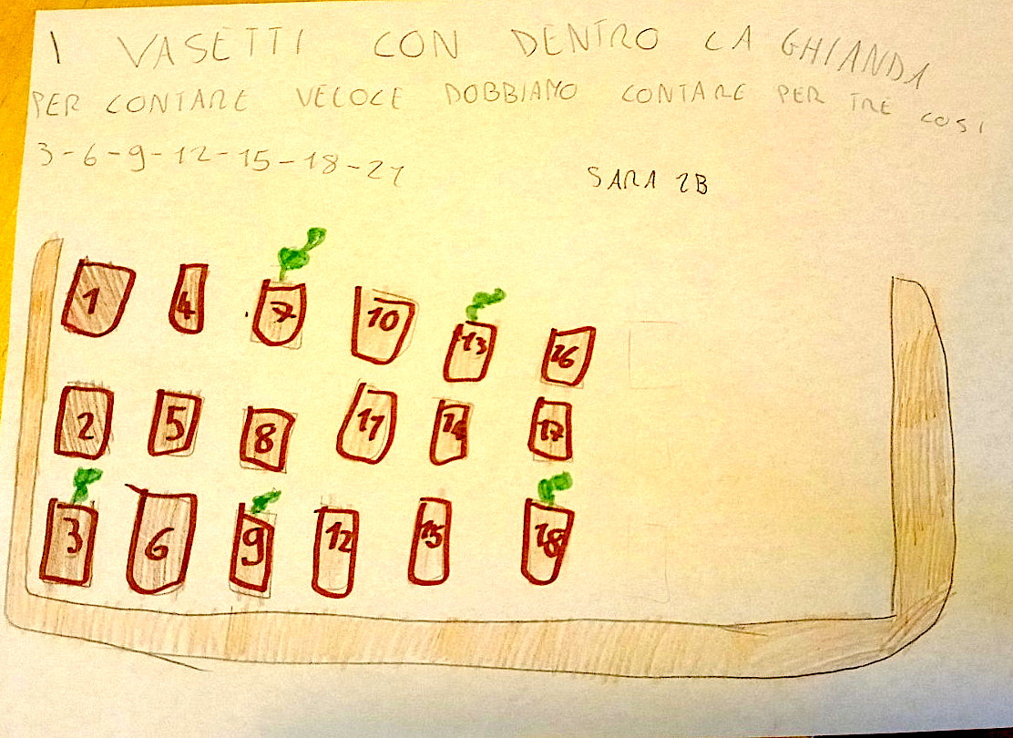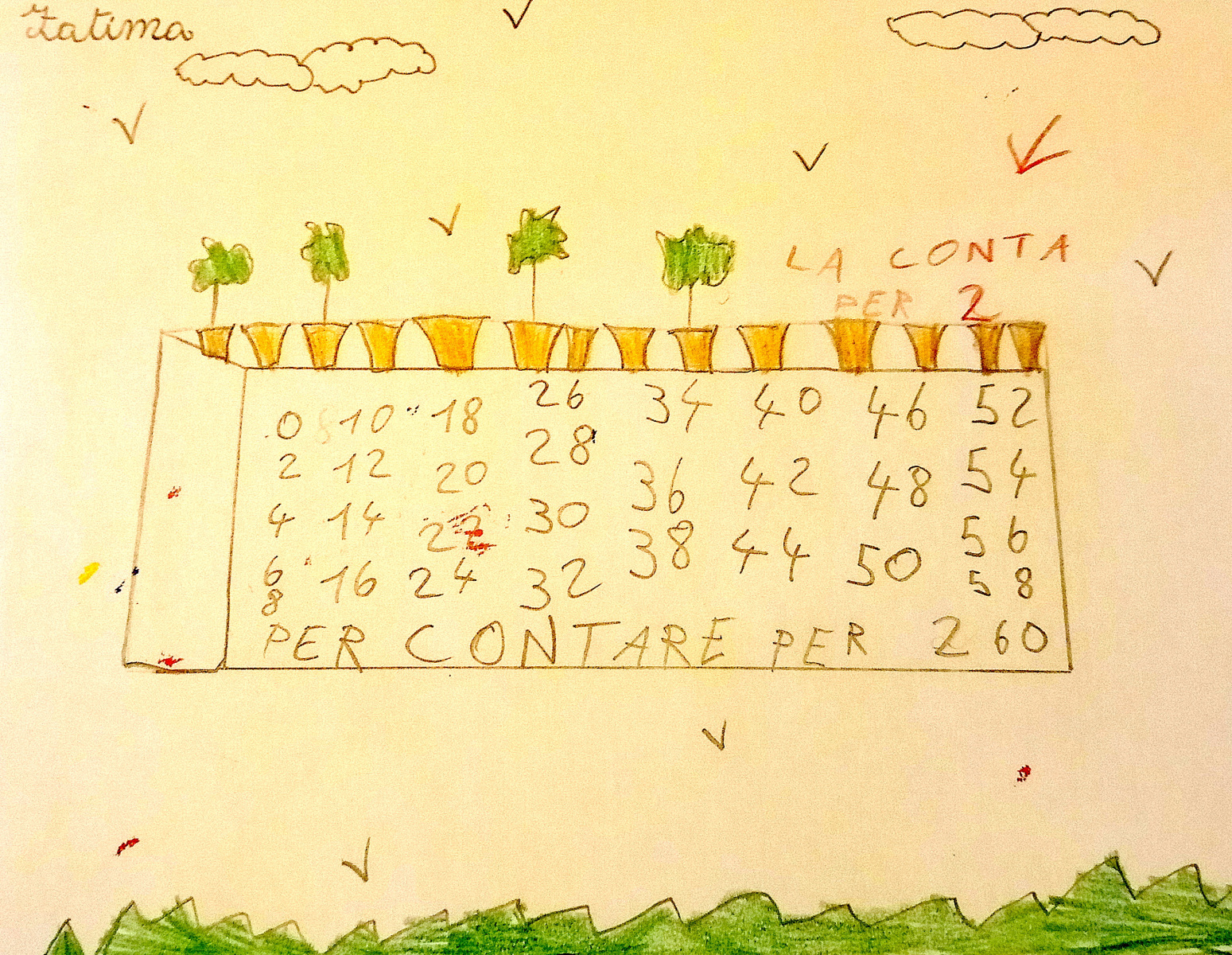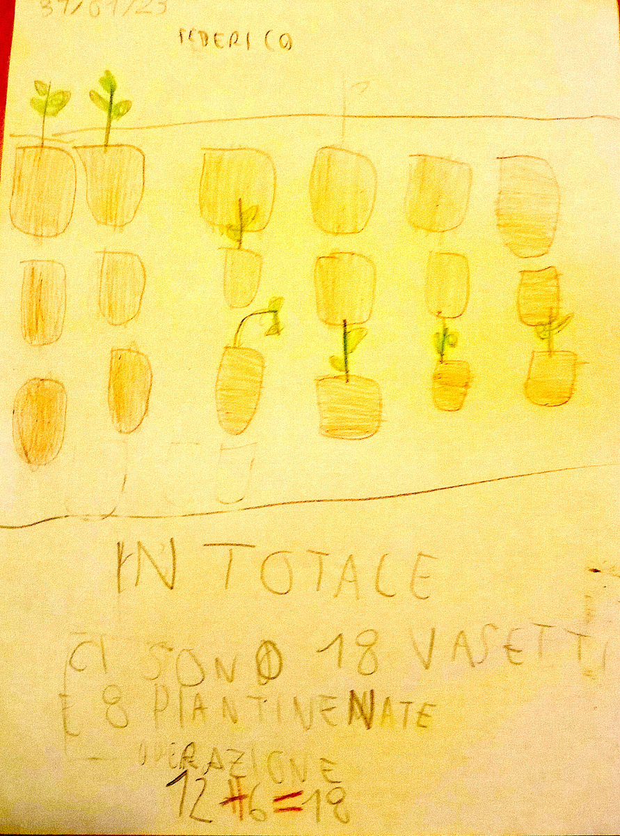 Ho chiesto: “C’è qualcosa di matematico nel modo in cui i vasetti sono disposti?” Ho dato un tempo di osservazione. In alcuni disegni colgo chiaramente l’idea di schieramento (anche se non ne abbiamo mai formalmente parlato), altri bambini si sono rifatti alla conta per due, conosciuta giorni prima, nel disegno però non sembra esserci sempre attinenza. Nei prossimi giorni vorrei dialogare con i bambini su questi elaborati per cogliere differenze e analogie nelle strutture rappresentate.