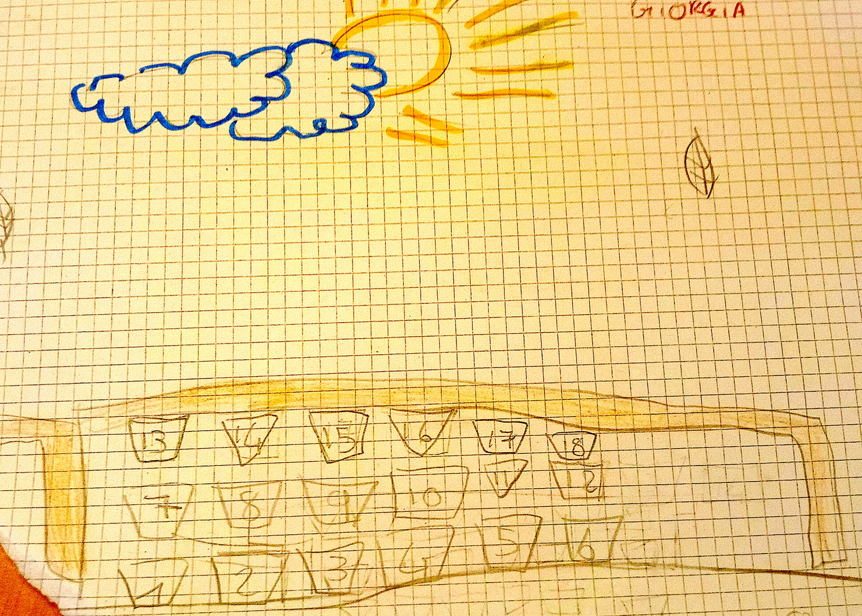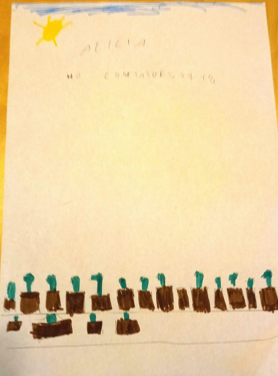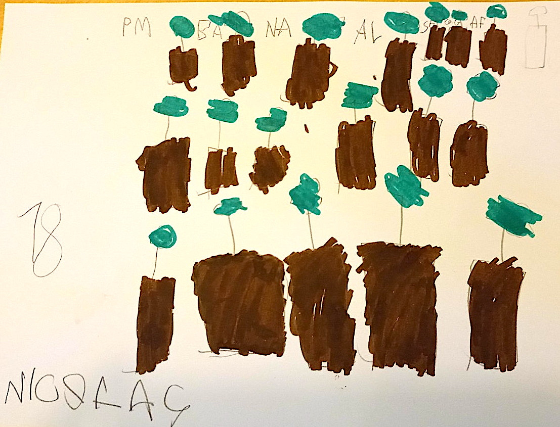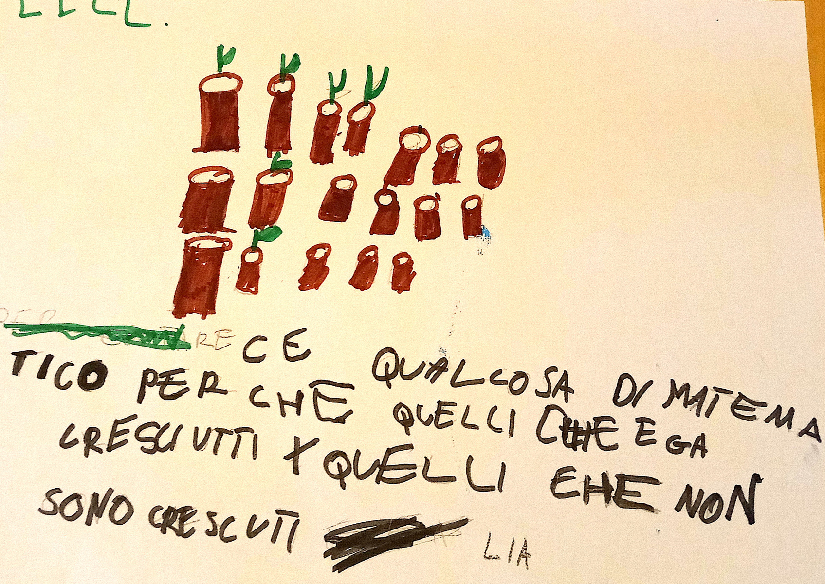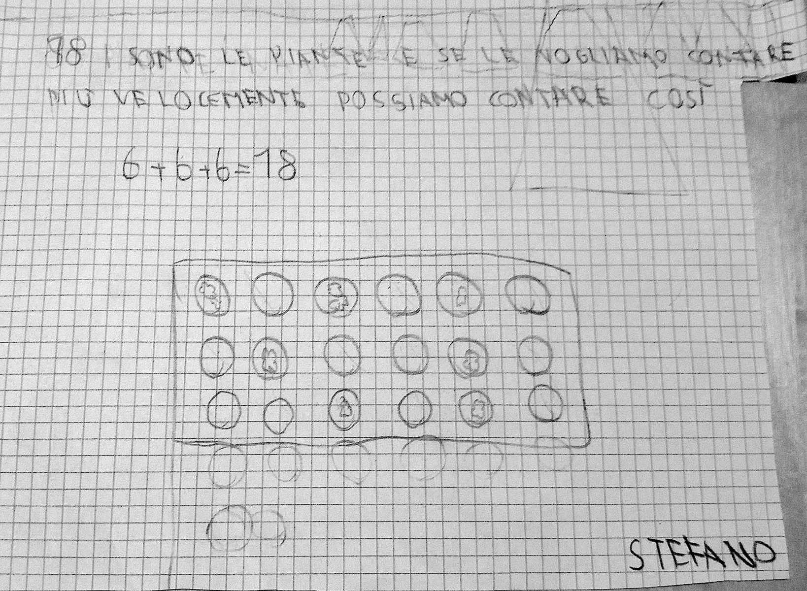 Ho chiesto: “C’è qualcosa di matematico nel modo in cui i vasetti sono disposti?” Ho dato un tempo di osservazione. In alcuni disegni colgo chiaramente l’idea di schieramento (anche se non ne abbiamo mai formalmente parlato), altri bambini si sono rifatti alla conta per due, conosciuta giorni prima, nel disegno però non sembra esserci sempre attinenza. Nei prossimi giorni vorrei dialogare con i bambini su questi elaborati per cogliere differenze e analogie nelle strutture rappresentate.