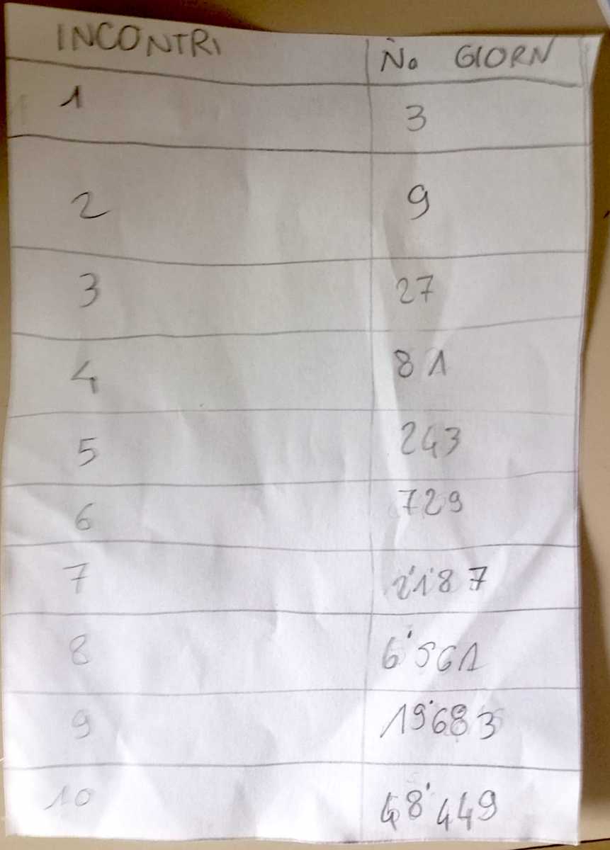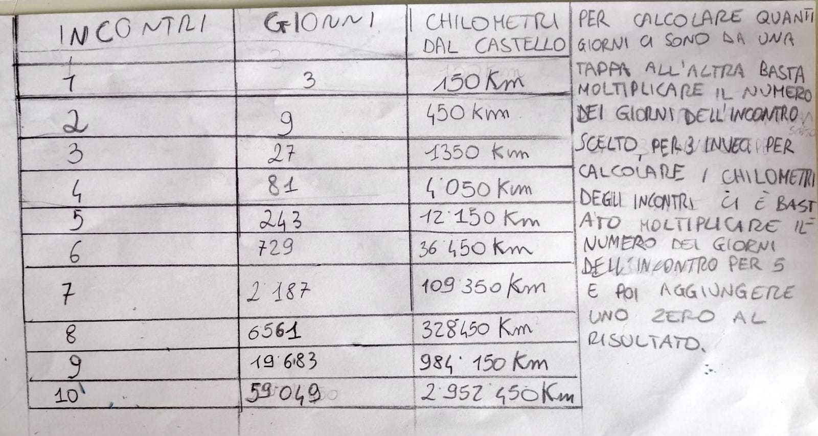 (era la fine dell’ottava ora di lezione e non me la sono sentita di portare avanti il discorso , ero fusa anche io, credo che questo gruppo abbiamo sommato i km fatti dai due personaggi capendo che il messaggero, tolto il primo giorno, fa sempre il doppio dei km del figlio del re, però non mi è chiaro come siano arrivati a capire che si incontrano la seconda volta dopo 9 giorni e la terza dopo 27 giorni)